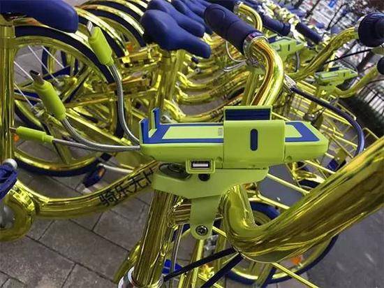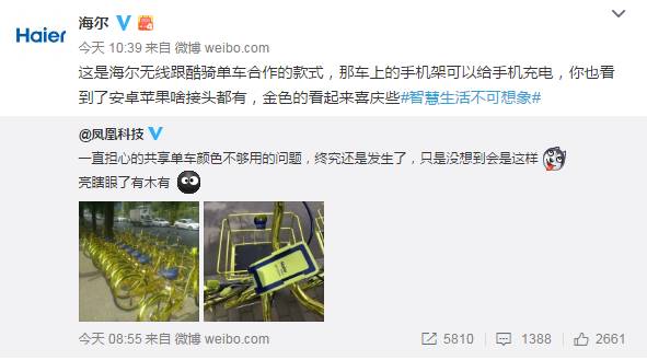 原来这是海尔无线跟酷骑单车合作的款式,车上的手机架可以给手机充电。至于为何会采用这种颜色,海尔的说法是:“金色的看起来喜庆些”。