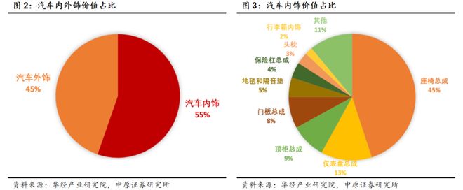 内饰件价值量高于外饰件价值量,内饰中座椅总成价值占比最高。根据华经产业研究院研究表明,2021年我国汽车饰件市场中,内饰件价值占比为55.3%,外饰件价值占比为44.7%,内饰件价值量占比高于外饰件,随着智能座舱渗透率上行、汽车座椅单车价值提升等行业趋势发展,预计汽车内饰件在内外饰中的占比将进一步提升。汽车内饰中,价值占比最大的为汽车座椅,占比45%接近一半,其次为仪表盘占比13%,其他内饰件价值较低,占比均低于10%。