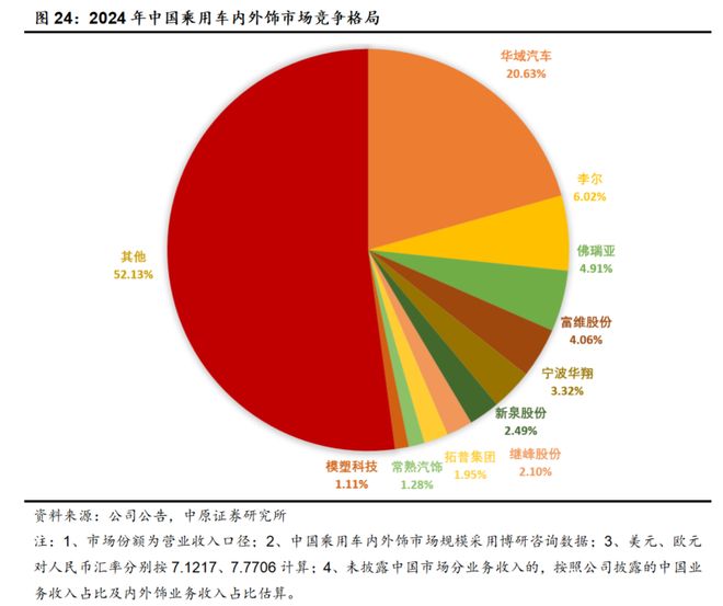 中国乘用车内外饰市场呈现头部企业引领,竞争分散的格局。2024年行业集中度CR5为38.95%,与全球行业集中度CR5接近,具体来看,2024年中国乘用车内外饰市场的前五名及对应市场份额为:华域汽车(延锋汽饰母公司,20.63%)、李尔(6.02%)、佛瑞亚(4.91%)、富维股份(4.06%)、宁波华翔(3.32%),合计占据市场38.95%的份额。从结构上看,本土企业华域汽车是唯一一家份额超20%的头部企业,而其余四家企业份额均低于10%,这既反映出头部企业已凭借主机厂资源或全球化技术优势形成一定壁垒,也体现出行业 “多品类、定制化” 的特性,企业难以通过单一品类实现大规模垄断,导致整体竞争格局仍较为分散。