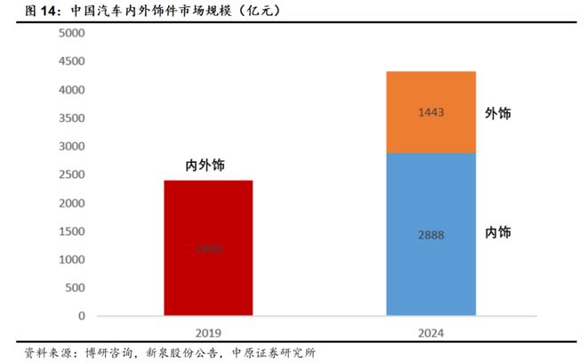 中国汽车内外饰行业迅速发展,市场规模占全球比例超30%。随着汽车行业快速发展以及私家车个性化需求日益增加,我国汽车饰件行业市场规模呈现持续增长趋势。我国内外饰部件行业增长高于全球整体水平,近年来行业产值年增长速度基本保持在15%~20%,目前占全球市场比例超过30%,2019年国内汽车内外饰部件总体市场规模约为2400亿元。2024年,中国乘用车内饰件市场规模约为2888亿元,同比增长率为7.3%,中国乘用车外饰件市场规模约为1443亿元,同比增长率为6.3%,这一增长趋势反映出国内整车制造能力的持续扩张以及消费者对车辆个性化、智能化需求的提升。