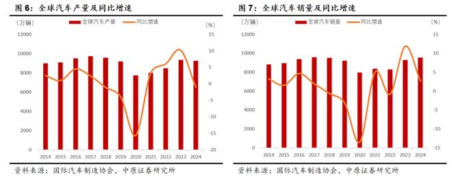 全球汽车产销量的稳步增长是汽车内外饰市场发展的核心驱动力,为整个行业提供了持续且庞大的需求基础。2024年全球汽车产销量分别为9250.43万辆、9531.47万辆,同比分别-1.01%、+2.65%,全球汽车产销量稳步增长,拉动座椅、保险杠、仪表盘等核心内外饰部件的刚性需求,为汽车内外饰市场规模增长奠定基础。