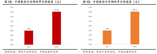 随着汽车产业向电动化、智能化转型,以及消费者驾乘要求提升,中国乘用车内外饰件单车价值量呈现逐年增长态势。随着汽车产业向电动化、智能化转型,以及消费者对驾乘体验要求的提升,内外饰已不再是简单的功能件和装饰件,而是成为定义车型个性、品牌差异和用户体验的核心环节。电动化简化了动力总成,使车企更专注于通过内饰设计打造空间;智能化将内外饰从静态部件转变为交互载体,如超大尺寸智能联屏、沉浸式声光系统以及集成大量传感器的智能大灯与保险杠,都极大地提升了技术的复杂性与单件价值;另外,消费者也不再仅仅满足于基础功能,而对座舱的质感、舒适性与健康环保提出了更高要求。多重因素共同推动了汽车内外饰单车价值量的显著提升。根据华经产业研究院数据,中国乘用车内外饰件单车价值量逐年增长,2022年中国乘用车内饰件及外饰件单车价值分别为5000元和2000元,预计2026年单车价值量将分别增加到5203.02元和2081.21元,复合增长率约为1%。