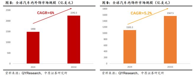 全球汽车内外饰件市场规模呈现稳步增长趋势,2031年市场规模预计增至2242.3亿美元。汽车饰件行业是汽车零部件领域规模最大的细分市场,涉及的产品众多,从行业体量上看,内外饰的整体行业规模巨大,占汽车零部件总体规模的近1/4。根据QYResearch的数据及预测,2024年全球汽车内外饰件市场规模达到1490亿美元,2025年将达到1571.8亿美元, 2031预计将增至2242.3亿美元,期间年复合增长率(CAGR)为6%。QYResearch调研显示,2024年全球汽车内饰件市场规模大约为1101.1亿美元,预计2031年将达到1567.5亿美元,期间年复合增长率(CAGR)为5.2%。