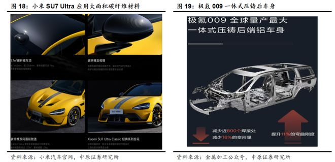 轻量化趋势旨在保证汽车的强度和安全性能的前提下,尽可能地通过采用轻型材料、结构优化、工艺升级等方式降低车身自重,从而达到提升燃油效率、节能减排、提高续航里程的目的,其中内外饰件对整车轻量化至关重要。材料方面,近年来开始以超纤皮革、天然/合成纤维、铝合金、镁合金、碳纤维、改性塑料以及各类加强复合材料等新材料替代传统的金属钢材,在满足强度的前提下实现减重;结构方面,模块化与拓扑/尺寸/形状优化,减少冗余材料与连接件数量,零部件薄壁化、中空化、小型化等方式,与材料轻量化协同,实现系统性降重;工艺方面,采用激光拼焊、液压/内高压成形、热冲压成形、化学/物理微发泡、CoreBack/CoreIn、高光/多色/免喷涂等先进成型技术,实现薄壁化与减重、提升表面与结构性能、降低零件数与连接点数量,通过一体化压铸将多零件高度集成,显著降本、提效并减重。轻量化对节能减排、提升燃油效率、提高续航里程的作用已被多方验证,根据中国汽车工业协会统计,燃油车空载情况下,约70%的油耗用在车身重量上,若汽车整车重量降低10%,燃油效率可提高6%-8%;整车重量每减少100kg,其百公里油耗可降低0.4-1.0L,二氧化碳排放量也将相应减少7.5-12.5g/km。纯电动汽车重量每减少100kg,行驶里程可增加10%,节约电池成本15%-20%。同时,汽车轻量化后,车辆加速性提高、车辆控制稳定性提升、制动距离缩短、碰撞冲击力减小、噪音和振动方面也均有改善,因此,轻量化成为车企在电动化与智能化竞争中提升产品力与成本效率的重要抓手,也是未来汽车内外饰的重要发展趋势。