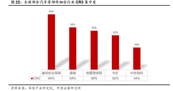 全球汽车内外饰行业呈现竞争格局相对分散、集中度较低的特点。一方面,汽车内外饰件细分产品繁杂,功能及工艺差异较大,技术门槛相对较低,单一公司难以覆盖所有细分品类,因此行业参与者众多;另一方面,下游车企对内外饰差异化和个性化需求高,供应链稳定、切换成本高,集中度提升较难,因此汽车内外饰市场呈现集中度偏低,高度分散的竞争局面。根据华经产业研究院统计,2022年,全球乘用车内外饰件(不含座椅及车灯)的市场CR3为33.56%,相较于其他汽车零部件细分领域,汽车内外饰行业由于自身的特点,集中度大幅偏低,明显低于以下细分行业:车灯2020年全球CR3为52%、热管理系统2019年全球CR3为59%、座椅2020年全球CR3为64%和被动安全系统2021年全球CR3为84%。