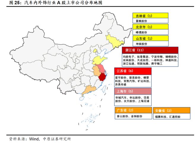 汽车内外饰行业A股上市公司在地域分布上呈现东部沿海聚集、围绕整车厂集群分布的特点。由于汽车内外饰件行业主要面向整车市场,体积大、仓储及运输成本高,基地需就近主机厂布局,因此其区域性与整车行业基本一致。目前,我国已经逐步形成了六大汽车产业集群—长三角产业集群、珠三角产业集群、西南产业集群、东北产业集群、中部产业集群、环渤海产业集群。经我们梳理,中信汽车行业A股上市公司中,主营业务及产品涉及汽车内外饰的上市公司共29家,从地域分布来看,以浙江为核心、多省份协同发展:其中,浙江省以绝对优势位居榜首,拥有多达11家相关上市公司,包括均胜电子、拓普集团、宁波华翔、继峰股份等营收规模庞大的行业龙头公司,展现了其在该领域强大的产业集群效应;江苏省和上海市紧随其后,分别拥有6家、5家相关上市公司,与浙江省共同构成了中国汽车内外饰产业的“长三角核心区”,汇聚了从大型综合零部件集团到细分领域的完整产业链;其他省份的分布则相对分散,广东省和安徽省各有2家相关上市公司,正在形成区域性的产业节点;而吉林省、北京市、山东省则各有1家相关上市公司,其中吉林省的富维股份凸显了其与东北老牌汽车工业基地的紧密关联。