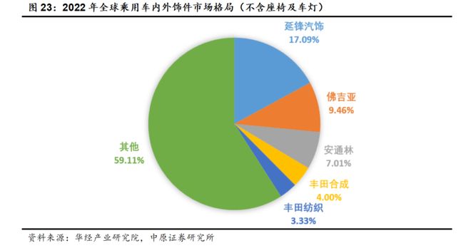 全球内外饰龙头中,除欧洲和日本的传统巨头参与外,中国企业已跻身头部。全球内外饰行业在过去十年内持续推进整合,主要内外饰企业市场份额逐渐提升,以延锋汽饰为代表的中国企业通过股权整合与技术升级快速崛起,占据行业头部位置。根据华经产业研究院数据,2022年,全球乘用车内外饰件(不含座椅及车灯)的前五名及市场份额分别为:延锋汽饰(中国,前身为中美合资,17.09%)、佛吉亚(法国,9.46%)、安通林(西班牙,7.01%)、丰田合成(日本,4%)、丰田纺织(日本,3.33%),合计占据市场40.89%的份额。欧美日等发达经济体汽车产业配套集群起步较早,产业基础深厚,带动了汽车饰件行业的发展,中国汽车产业近年来快速发展,本土企业不断整合升级,以延锋汽饰为代表的中国企业通过股权调整实现自主可控,依托国内庞大的市场需求及新能源汽车产业红利,逐步成长为全球内外饰领域的重要力量。