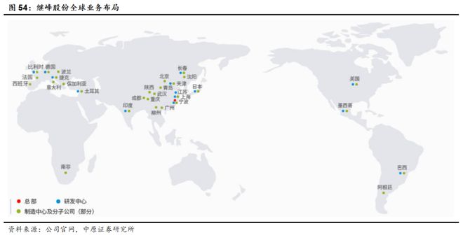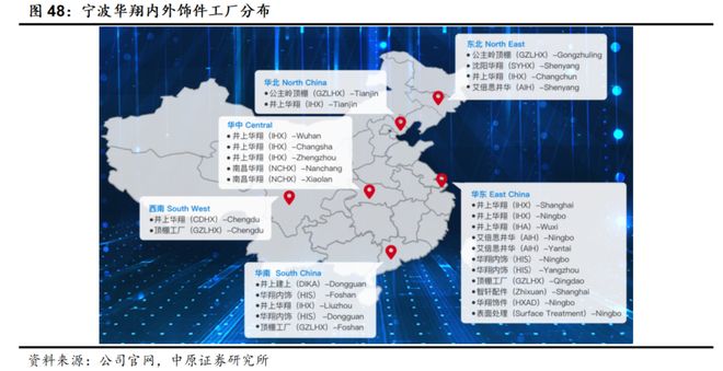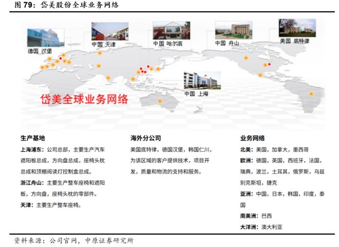 公司拥有完备的生产基地布局,并已基本完成生产基地的全球布局。公司在全球拥有超过60家生产基地及3家区域研发中心,在北美、欧洲、南亚均拥有分支机构。国内方面,公司已拥有宁波、上海、长春、沈阳、成都、天津、佛山、青岛、重庆、长沙、武汉、南京、合肥、芜湖等多家生产基地,与目前国内重要主机厂的布局相匹配;国外方面,公司也已建立北美(墨西哥、美国、加拿大)、东南亚(印尼、越南、菲律宾)多个生产基地。公司通过持续布局建厂,形成规模效应,与主机厂保持在较短的运输半径内,节约管理成本,提升供货效率,形成高效的配套网络,稳定公司长期发展。