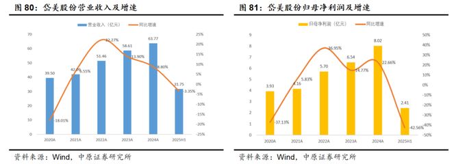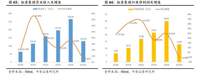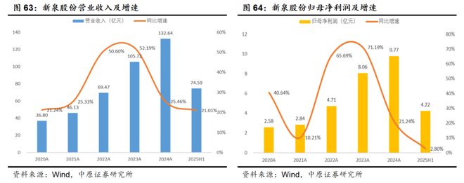 公司近五年营业收入及归母净利润保持快速增长趋势。2024年营收266亿元、同比+35.02%,归母净利润30.01亿元、同比+39.52%,增长显著且规模创新高;2025年上半年实现营收129.35亿元、同比+5.83%,归母净利润12.95亿元、同比-11.08%,在高基数后收入增速有所回落,归母净利润较去年同期小幅下滑。