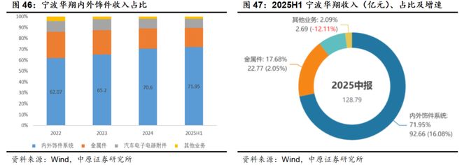 公司内外饰件收入占比自2022年以来持续上行。2022年、2023年、2024年公司内外饰收入占比分别为62.07%、65.20%、70.60%,2025年上半年进一步至71.95%,体现公司收入结构向核心优势板块聚焦并强化的趋势。公司一方面持续迭代客户结构,新能源及自主品牌占比提升,带动以内外饰为核心的座舱相关配套加速放量,从而抬升内外饰合计占比;另一方面公司加大研发力度,在现有内外饰基础上不断进行产品迭代升级,并且计划通过并购方式补齐汽车座椅的产品空白,形成全座舱的模块化供货能力,预计公司未来内外饰件收入将保持稳定增长。