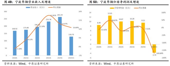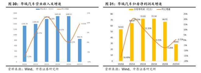 公司近五年营业收入稳健增长,归母净利润波动相对较大。2024年营收263.24亿元、同比+13.07%,规模创新高,而归母净利润9.53亿元、同比-7.51%,营业收入逐年扩张主要得益于客户结构优化与产品升级,利润端波动较大主要受海外亏损与结构切换影响。2025年上半年实现营收128.79亿元、同比+10.89%,主要系自主品牌对国内收入(如井上华翔、华翔内饰等子公司)的贡献逐渐提升,同时,埃驰中国本期并表相应增加营业收入;归母净利润-3.74亿元、同比-169.84%,主要由于欧洲业务剥离以及北美井上回购事项产生非经常性损失10.20亿元,剔除以上因素外,扣除非经常性损益的归母净利润为6亿元,同比增长26.44%,北美减亏效果达到预期,同时国内降本增效显现,毛利率逐步修复。