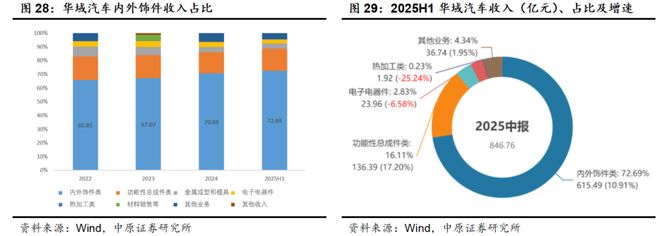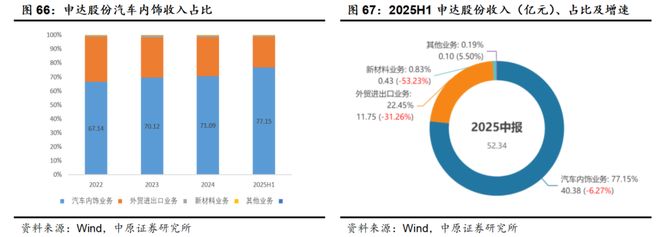 公司主要客户为通用、福特、捷豹路虎、戴姆勒、斯特兰蒂斯、丰田、本田、大众、宝马、吉利沃尔沃、蔚来、理想等。2025年上半年,汽车内饰板块主营业务收入40.38亿元,较去年同期减少6.27%。境内汽车内饰业务主要客户包括奔驰、吉利、宝马、大众、蔚来、通用等,因部分客户项目产品已临近供货周期尾声,承接的新项目尚在爬坡期,2025年上半年度境内主营业务收入9.79亿元,较去年同期降低12.20%;境外企业因受欧美地区整车客户产量下降影响,主营业务收入为30.71亿元,较去年同期降低4.25%。