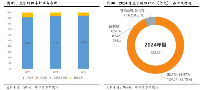 公司产品收入包括车灯、控制器、三角警示牌以及其他业务收入,其中以车灯业务收入为主,近三年在公司收入比重保持在90%以上并呈逐年上升趋势。2024年车灯类收入实现124.54亿元,同比增长29.75%,占总营收的比例为93.97%。