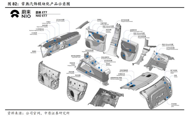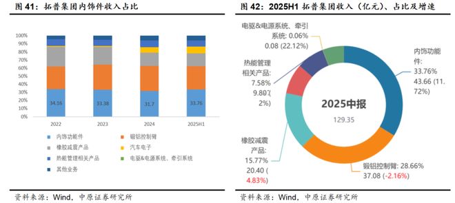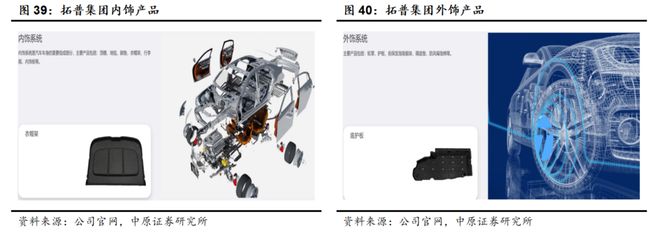 公司主营业务为汽车零部件的研发、生产及销售,主要产品包括汽车NVH 减震系统、内外饰系统、轻量化车身、智能座舱部件、热管理系统、底盘系统、空气悬架系统、智能驾驶系统共八大业务板块。内外饰系统业务板块方面产品包括:汽车门板、顶棚、主地毯、衣帽架、隔音隔热件、行李箱隔音件等隔声降噪产品,以及密封条、装饰条等外饰类产品,在内饰系统领域,全新研发的高端材料已持续实现市场落地,其中高仿皮质顶棚则已应用于新款赛力斯 M9 车型,新型材料门内饰板已成功获得LUCID等新能源车企的订单,产品竞争力持续凸显。