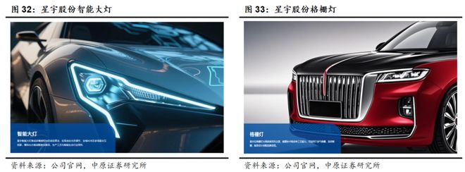 星宇汽车灯具主要包含智能前照灯、智能信号灯以及前照灯、信号灯。智能前照灯、信号灯系列主要涉及百万级像素、万级像素、智能matrix LED、ISD像素化显示、MINI LED等先进技术,使得汽车灯具更加智能化;前照灯、信号灯系列主要涉及近光、ADB模组、surface led、OLED、熏黑等常规技术,以此来满足常规车型的使用。