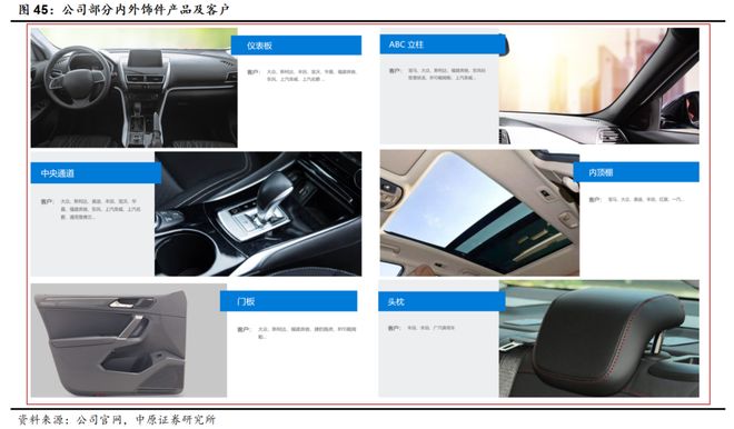 公司业务包括乘用车内外饰件、车身金属结构件、汽车后视镜、电子电器附件和其他业务,经营区域涵盖亚洲、北美及欧洲市场。公司内外饰主要产品包括:仪表总成、中控总成、门板总成、顶棚总成、立柱总成、后备箱零件、头枕、风管、格栅、加油/充电口盖、真木/真铝/IMD/INS/氛围灯透光等装饰条、电动踏板等内外饰件。