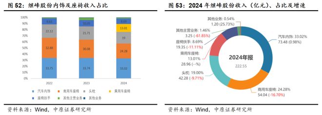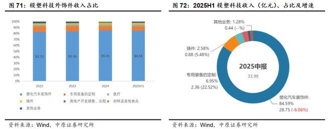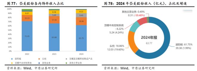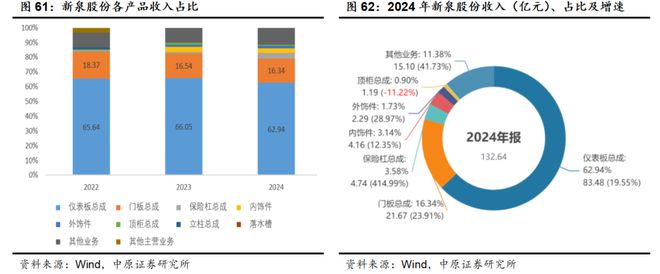 公司是汽车饰件整体解决方案提供商,拥有较为完善的汽车饰件产品系列。主要产品包括仪表板总成、顶置文件柜总成、门内护板总成、立柱护板总成、流水槽盖板总成和保险杠总成等,并已实现产品在商用车及乘用车应用领域的全覆盖。其中,仪表板总成和门板是公司的两大核心产品,合计占到公司收的80%左右,2024年两项业务收入呈持续增长。