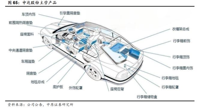 公司是一家以产业用纺织品研发与制造和进出口贸易为主的多元化经营上市公司,主要业务包括汽车内饰及声学元件、纺织新材料和进出口贸易。汽车内饰及声学元件业务是公司产业用纺织品的核心业务,也是目前规模最大的主营业务,主要为下游客户提供汽车内饰件和应用于降低车内噪音的声学解决方案。主要产品包括:地板系统产品,包括地毯及配件垫;声学元件产品,主要指在汽车内部起到隔音作用的绝缘件产品,包括隔音前围、一般隔音材料、以及轮拱内衬;软饰小件产品,指的是安装在汽车驾驶舱、车厢、后备箱等各部位的内饰、软饰部件,包括后备箱饰件、包装托盘、及其他内饰零部件。