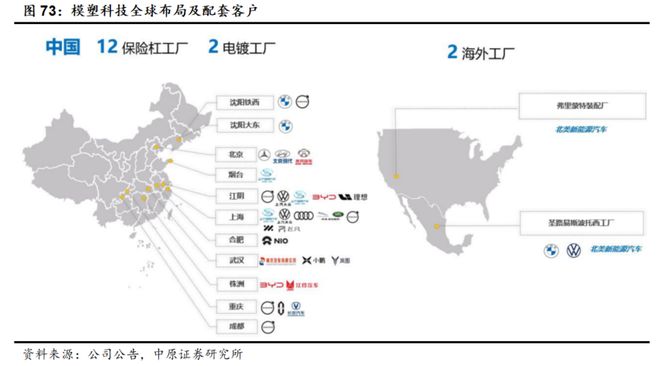 公司已形成覆盖全球的产业布局,在汽车外饰件保险杠细分领域占据行业领先地位,年汽车保险杠生产能力达600万套以上。公司目前已在无锡、上海、沈阳、武汉、烟台、墨西哥设有生产基地,在北京、上海及江阴设有研发中心。参股公司北汽模塑在北京、合肥、重庆、成都、株洲设立生产基地,就近为主机厂提供服务。目前国内成规模厂商中,模塑科技的生产规模和配套能力排在行业前列。
