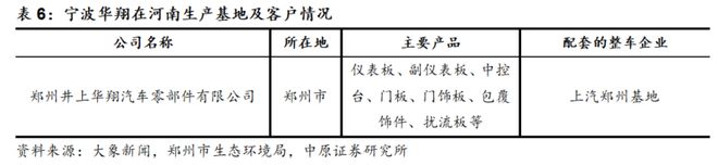 宁波华翔在河南省设有子公司及生产基地,是上汽郑州工厂一级配套企业。宁波华翔子公司郑州井上华翔汽车零部件有限公司成立于2017年6月27日,注册资本1000万元人民币,注册地址位于河南省郑州市中牟县姚家镇轩城大道与轩兴街交叉口向东100米路北1号2号厂房,主要从事汽车内外饰件的研发、制造及进出口业务,产品涵盖仪表板总成、门板总成等,拥有6项实用新型专利。公司2018年开始进行厂房建设,建成年产27.1万套汽车仪表板、 副仪表板、1.5万套尾门饰板、扰流板总成、C柱及5万件包覆件及年产10万套门板线万套仪表板、副仪表板、门板等内外饰件项目,该项目总投资4500万元。