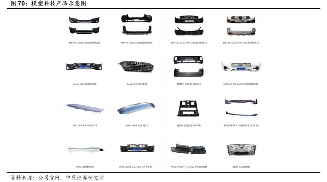 模塑科技是中国领先的汽车零部件供应商,主营业务聚焦于汽车保险杠等汽车外饰系统及轻量化零部件的研发、生产和销售。公司产品体系覆盖汽车外饰件及内饰件产品、创新智能部件两大领域,主要产品为汽车外饰件产品。公司的汽车饰件产品主要分为汽车外饰塑件和内外饰电镀件。其中,汽车外饰塑件包括前后保险杠总成、门槛总成、前后翼子板总成、散热器格栅总成、塑料尾门、车身防擦条等。汽车内外饰电镀件包括电镀格栅、雾灯盖板总成、车身装饰条、Logo 等产品。创新智能部件主要包括:发光格栅(集成位置灯与呼吸灯功能)、主动进气格栅(AGS)等部件。