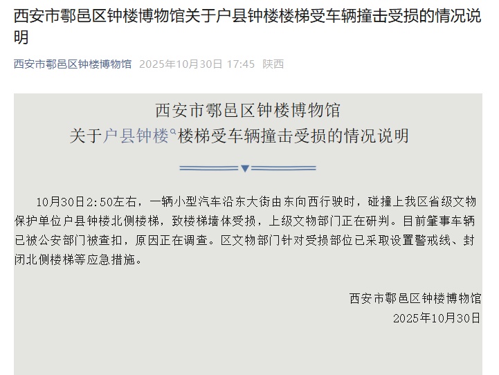 30日上午,鄠邑区文物管理所工作人员对极目新闻记者称,30日凌晨,钟楼里的值班人员听到撞击声后发现是一辆轿车撞到了钟楼北侧楼梯。经初步了解,楼梯栏杆移位,栏杆下方墙面受损,具体情况还需专家进一步勘查评估。事发后,鄠邑区交警、文保等部门介入调查。